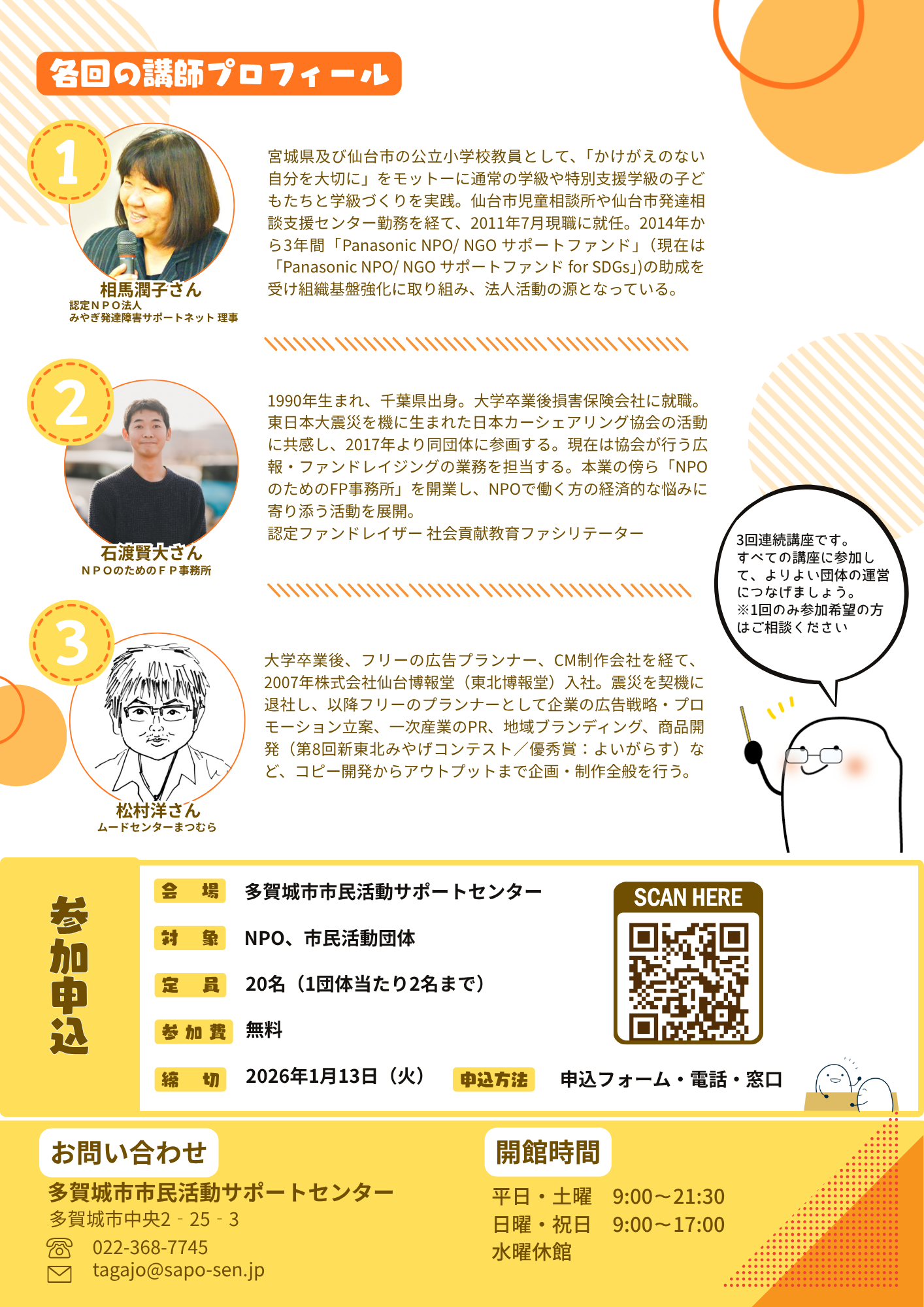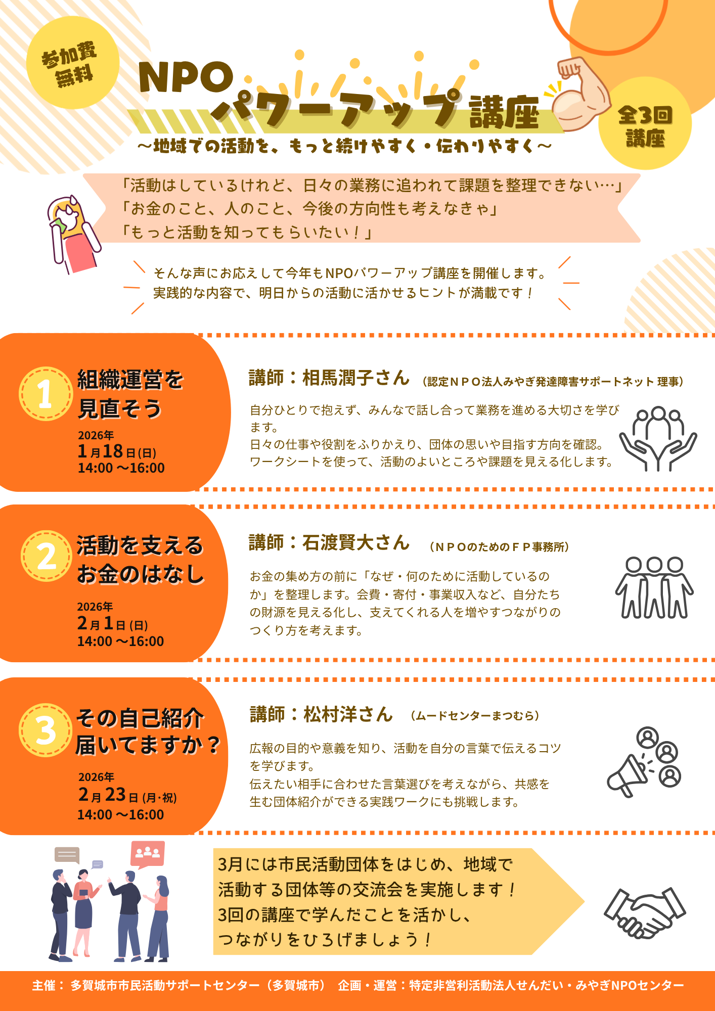 1/18(日)、2/1(日)、2/23(月・祝) 3回連続 NPOパワーアップ講座(全3回)開催します