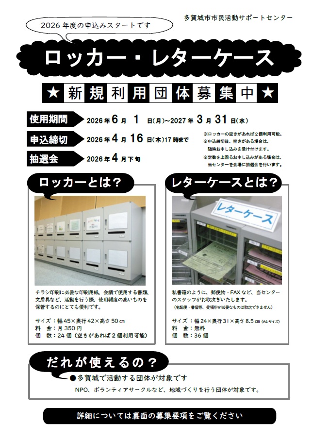 たがさぽでは現在、NPOや地域団体、ボランティアサークルなど、地域づくりに取り組む団体を対象に、6月利用開始となる事務用ロッカー・レターケースの利用団体を募集しています。